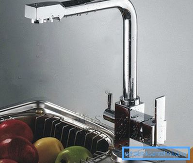 - Kitchen. Külön kiemelik a magas keverőfülke jelenlétét, hogy a teljes edényeket alá helyezzük, egy speciális alakú sugárhajtást, amely minimalizálja a zajt és fröcsköl, ha egy patak nagy magasságból, egy forgó ganderből és más árnyalatokból esik. Néha van egy visszahúzható öntöződoboz vagy öntöződoboz a rugóhoz;