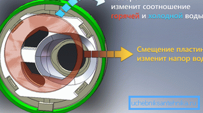 - A hideg és forró víz áramlását a függőleges tengely körüli gömbölyítéssel állíthatja be - ebben az időben két bemenet nyílik teljesen vagy részben, és a nyomás intenzitása vízszintes tengely körül forgatható - a nyílás keresztmetszete állítható vagy teljesen le van zárva.