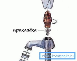 Mint már említettük, a leggyakoribb hibás szelep keverő - a tömítés meghibásodása. Ezért először is példaként megvizsgáljuk, hogyan kell szétszerelni a csapot a kétszelepes fürdőszobában.
