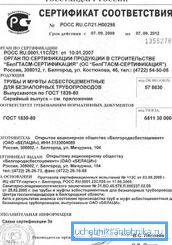 Annak ellenére, hogy sok fejlesztőnek az azbeszttermékekre erősen negatív attitűdje, az ilyen típusú termék igen népszerű, és ha a telepítést az előírásoknak megfelelően hajtják végre, az egészségkárosodás kockázata minimális. Az azbesztcement cementcsöveket a GOST 539-80 "Azbesztcement csövek és csatlakozók" szerint gyártják, és ha a termékek megfelelnek e szabályozási aktusnak, akkor számos művet használhatnak.