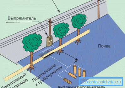 - Elektromos vízelvezetés elleni védelem Ez egyben passzív módszer, amelyet a csővezetéknek a földelő áramkörhöz történő csatlakoztatásával, az EMP szerint készült. Ez a módszer segít megszabadulni a kóbor áramok előfordulásától, és a csővezeték elhelyezkedésénél a földi vagy a vasúti közlekedés érintkezési villamos hálózatának közelében használják.