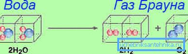 A fő feladat a hidrogén előállítása minimális költséggel. Az ilyen fűtés fő elemei közé tartozik egy elektrolízisre szolgáló berendezés, amely desztillált vízzel ellátott tartályból, a folyadékba merített fémlemezből és áramforrásból áll. Amikor a katódon és az anódon áramot adnak át, oxigén és hidrogén kerül kibocsátásra a vízből, a keletkező gázot fűtésre használják.