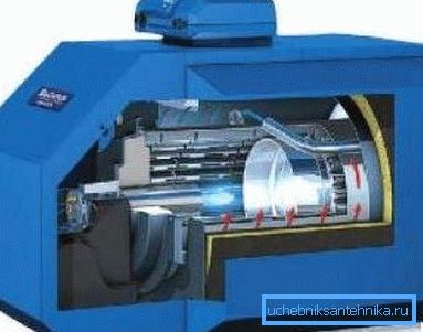 De ilyen kazánt használnak. Az a tény, hogy a leírt fűtőelem égője gáz felhasználásával alakítható át.