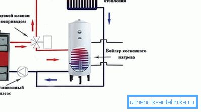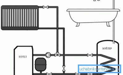 Amint látja, itt a rendszer más: a kazán felmelegíti a hűtőfolyadékot, amely a fűtési rendszerben kering. Mindazonáltal egy külön áramkör át van irányítva a csővezeték általános hálózatából, amely közvetíti a közvetett fűtőkazánt.