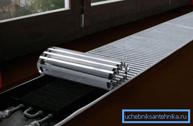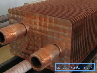 Ascetic kívül, a konvektorban a vízmelegítés bonyolultabb. A "szívük" hőcserélőnek minősül, amely rézlemez vagy cső egy tekercs formájában. Ez merőleges a módszer a szorosan illeszkedő lamellák csatolták.