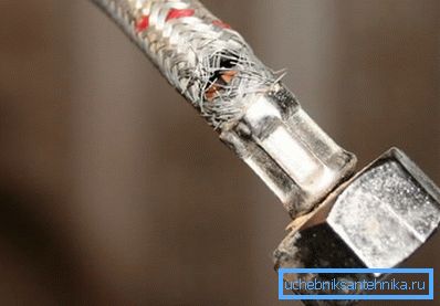 - A bélés elégtelen préselése és ennek következtében a szivárgás lehetősége. A statisztikák szerint a fonott vízvezeték-tömlők több mint fele kézművességből készül, nem automatizált berendezéssel és a nyilvánvalóan alacsony minőségű fémmel.
